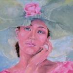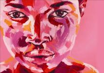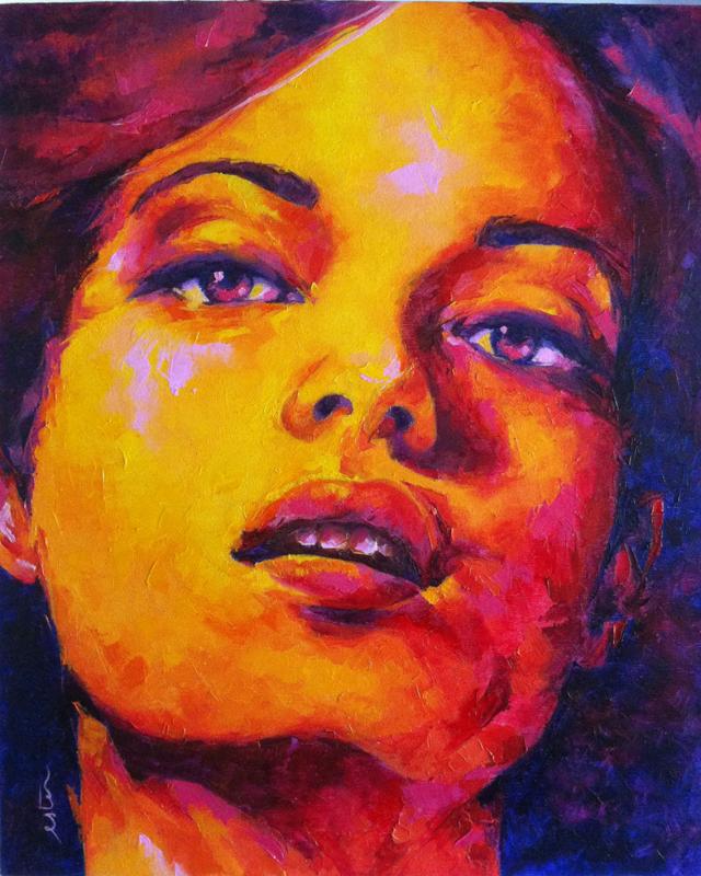 I suoi soggetti preferiti sono i volti. Era un po’ scocciata, però, dal dover usare sempre gli stessi colori, e lasciare molti dei tubetti della confezione inutilizzati: ha provato nuove tecniche, e si è appassionata a quella che sta usando per gli ultimi quadri – appunto – colori accesi giustapposti sulla tela con lo spatolato.