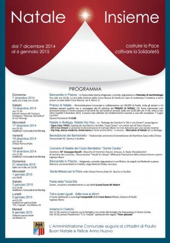 Pranzo di Natale - L’Amministrazione Comunale in collaborazione con l’AUSER di Paullo, invita gli anziani e chi desidera passare qualche ora in compagnia alla 6ª edizione del PRANZO DI NATALE. Chi fosse interessato può prenotarsi presso il Centro Anziani di via Verdi 44, dal lunedì al venerdì, dalle ore 14.00 alle ore 17.00, entro e non oltre martedì 9 dicembre 2014. Il pranzo sarà allietato da intrattenimenti musicali a cura del complesso “I Cugini Lucchini”
