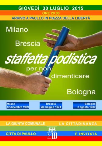 Giovedì 30 luglio 2015 Ore 20:00 Arrivo a Paullo in Piazza della Libertà Per non dimenticare Milano, 12 dicembre 1969 Brescia, 28 maggio 1974 Bologna, 2 agosto 1980 La Giunta Comunale della città di Paullo Tutta la cittadinanza è invitata