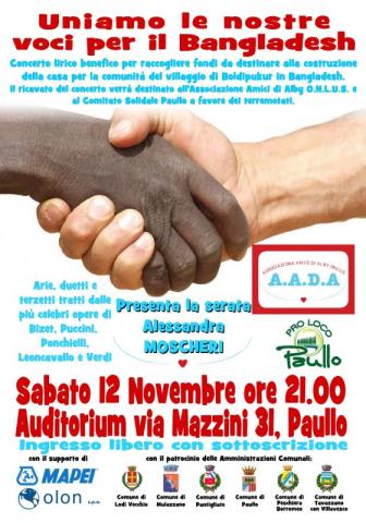 Concerto lirico benefico per raccogliere fondi da destinare alla costruzione della casa per la comunità del villaggio di Boldipukur in Bangladesh. Il ricavato del concerto verrà destinato all'Associazione Amici di Alby Onlus e Comitato Solidale Paullo a favore dei terremotati.