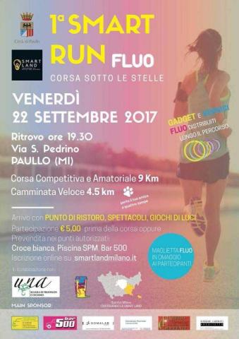 Il municipio di Paullo, in collaborazione con “Smart Land - Costruire le città del futuro” e con il patrocinio dei comuni di Peschiera Borromeo e San Donato Milanese, si sta occupando dell’organizzazione della prima “Smart Run Fluo”. L’evento, in programma per venerdì 22 settembre, con ritrovo in via San Pedrino a partire dalle ore 19.30, consiste in una corsa sotto le stelle rischiarata da variopinte sfumature fluorescenti.