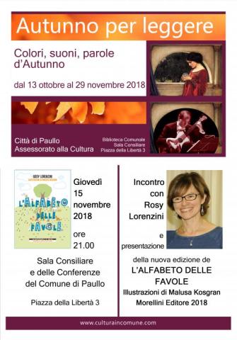 Giovedì 15 novembre 2018 ore 21.00 Sala Consiliare e delle Conferenze del Comune di Paullo Piazza della Libertà 3 Incontro con Rosy Lorenzini e presentazione della nuova edizione de L’ALFABETO DELLE FAVOLE Illustrazioni di Malusa Kosgran Morellini Editore 2018