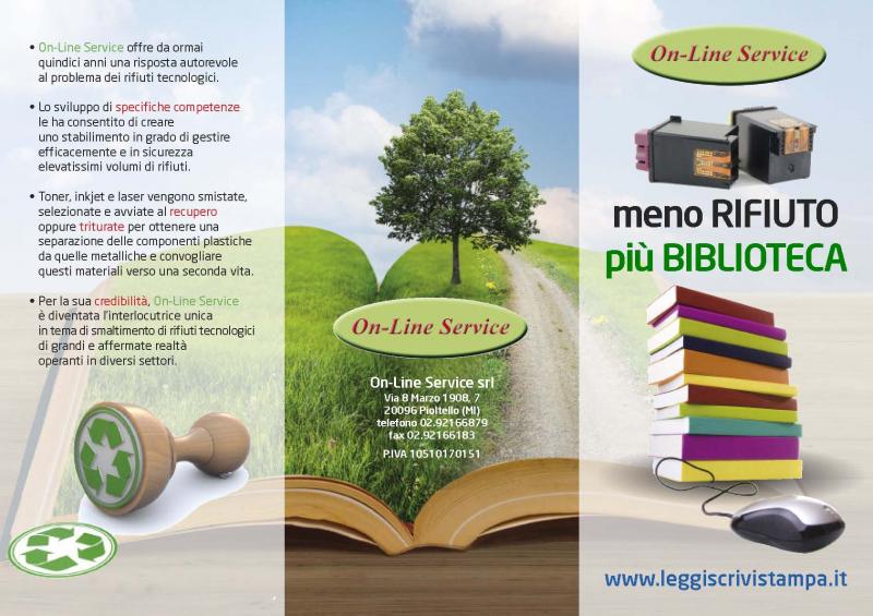 La ditta On-Line Service si occuperà di raccogliere questi rifiuti tecnologici esausti e attraverso il loro smaltimento e riciclo valorizzerà il TUO gesto arricchendo la dotazione della biblioteca.