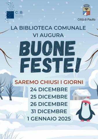 La Biblioteca Comunale di Paullo vi augura BUONE FESTE! Saremo chiusi i giorni: 24 - 25 - 26 - 31 dicembre 2024 e 1 gennaio 2025