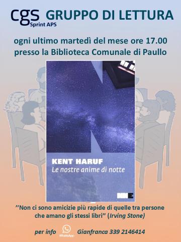 Il prossimo incontro del Gruppo si terrà martedì 24 giugno 2025. Si parlerà dei romanzo 'Le nostre anime di notte' di Kent Haruf.