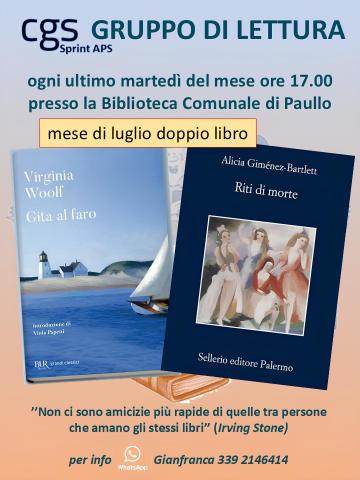Il prossimo incontro del Gruppo si terrà martedì 29 luglio 2025. Si parlerà dei romanzi 'Gita al faro' di Virginia Woolf e 'Riti di morte' di Alicia Gimenez-Bartlett.