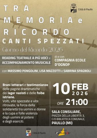 La compagnia ECOLE D’OGNOP, composta da Massimo Pongolini (voce, chitarra), Lisa Mazzotti (voce), Sabrina Spagnoli (voce) e altre voci proporranno un reading teatrale a più voci e accompagnamento musicale. Attraverso i brani letterari si testimonieranno alcune tra le pagine più drammatiche delle foibe istriane, i volti, le vite spezzate ma anche le vite ritrovate, la forza della solidarietà tra uomini e donne e la cupa e folle violenza degli uomini al potere e degli eserciti.