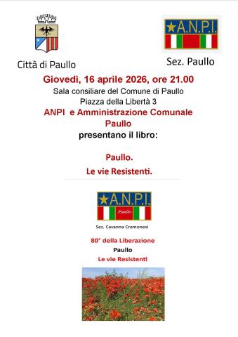 Giovedì, 16 aprile 2026, ore 21.00 Sala Consiliare del Comune di Paullo, piazza della Libertà 3 ANPI e Amministrazione Comunale di Paullo presentano il libro: "Paullo, le vie Resistenti"